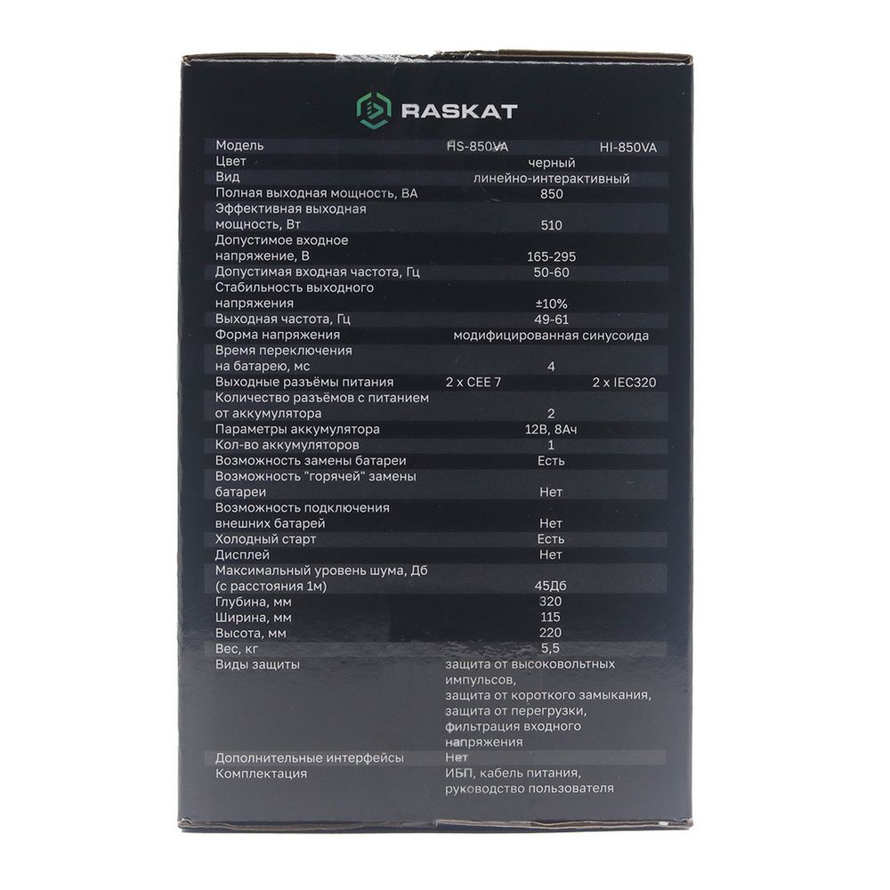 Raskat HI-850VA обеспечивает стабильное питание и защиту от скачков напряжения, что помогает предотвратить повреждение оборудования и потерю данных. Благодаря компактным размерам и простоте использования, этот ИБП является идеальным решением для дома и офиса.