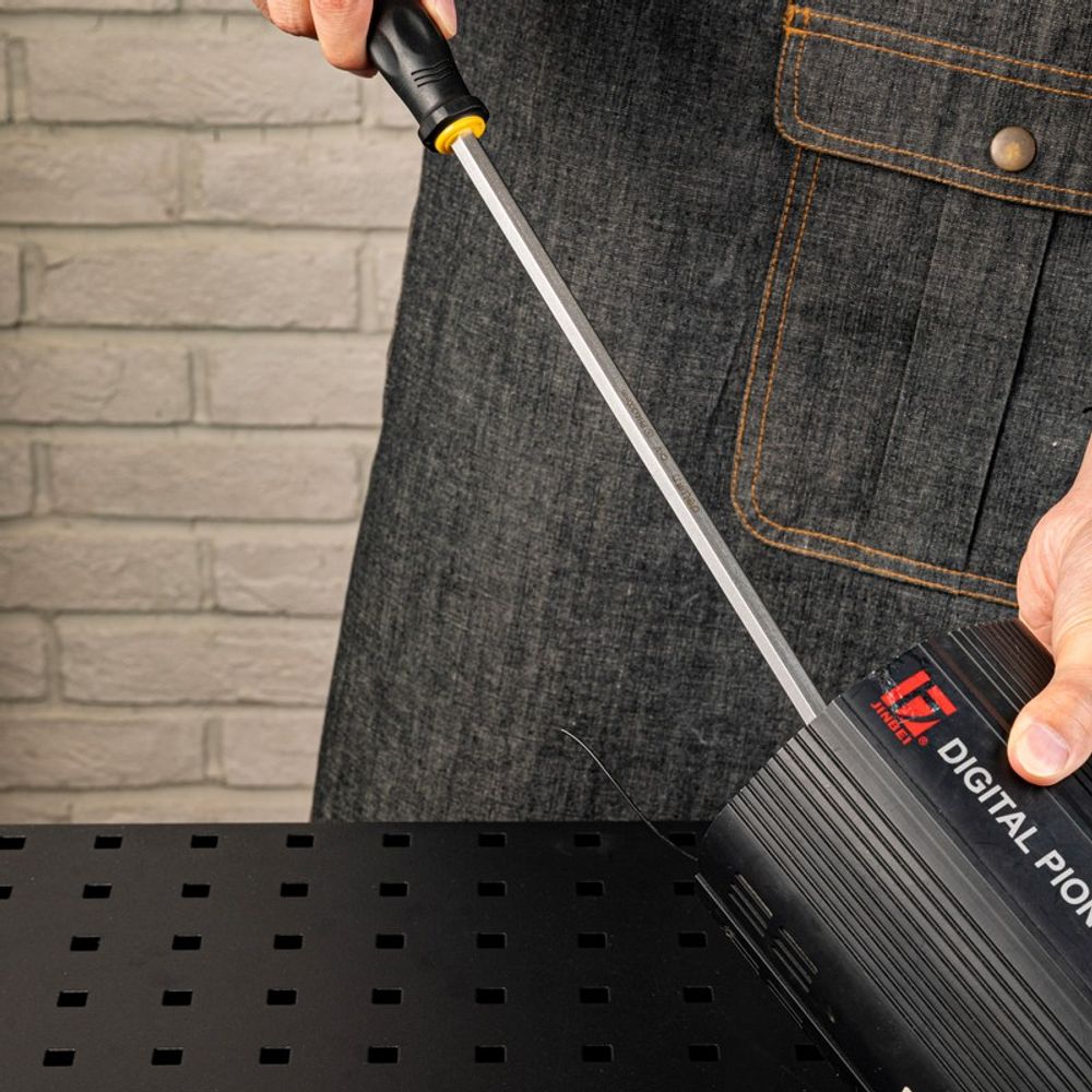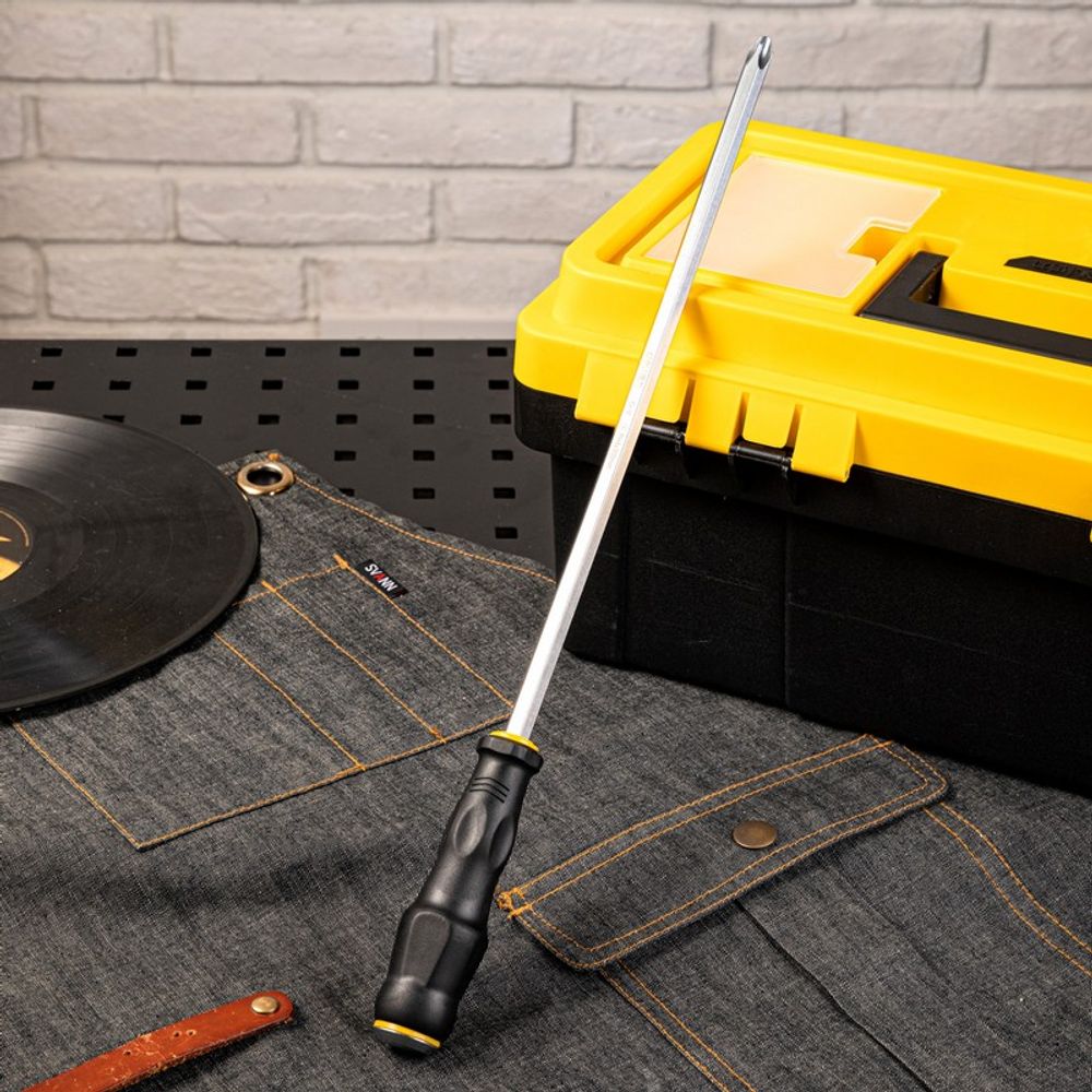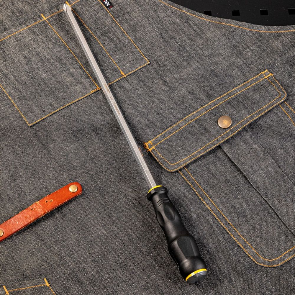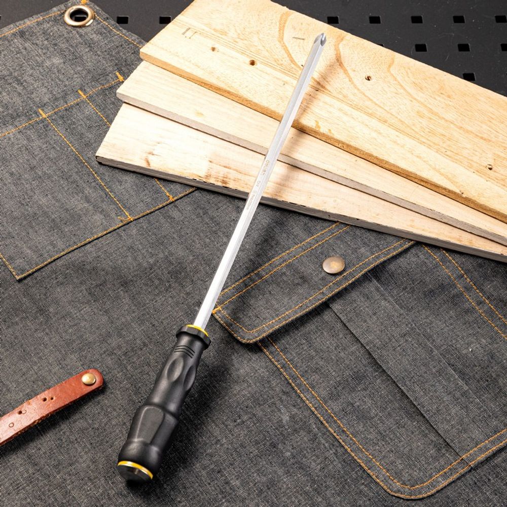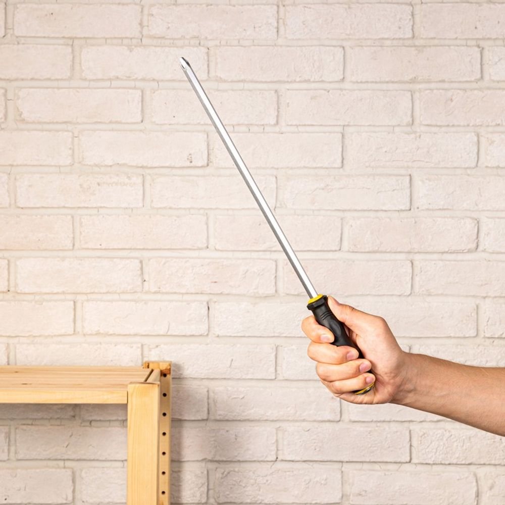 Сквозной хвостовик обеспечивает удобство и надёжность при работе с инструментом. Благодаря своей конструкции, отвёртка выдерживает удары молотком, что позволяет справляться даже с самыми тугими крепежами.