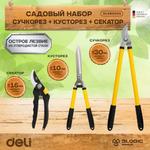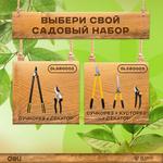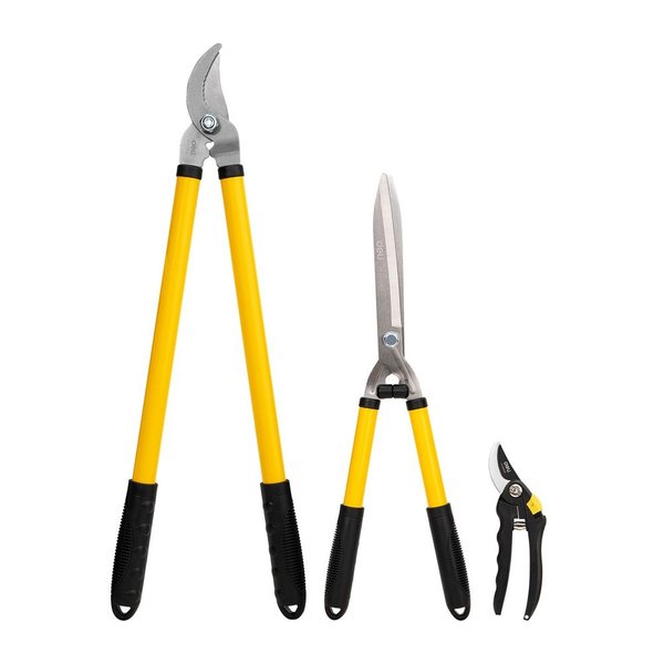 Набор включает в себя сучкорез, кусторез и секатор. Инструменты предназначены для обрезки веток и формирования кроны деревьев и кустарников.
