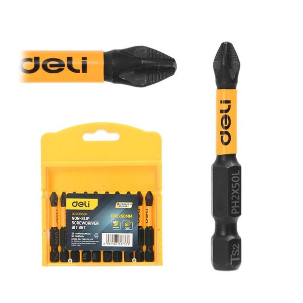 Набор торсионных бит с противоскользящими насечками для ударных шуруповертов 10шт Deli DL251050K PH2*50мм, сталь S2, пласт.кейс. Бренд: Deli. Артикул: DL251050K.