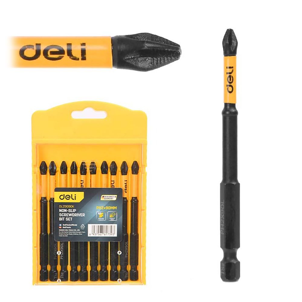 Набор торсионных бит с противоскользящими насечками для ударных шуруповертов 10шт Deli DL251090K PH2*90мм, сталь S2, пласт.кейс. Бренд: Deli. Артикул: DL251090K.
