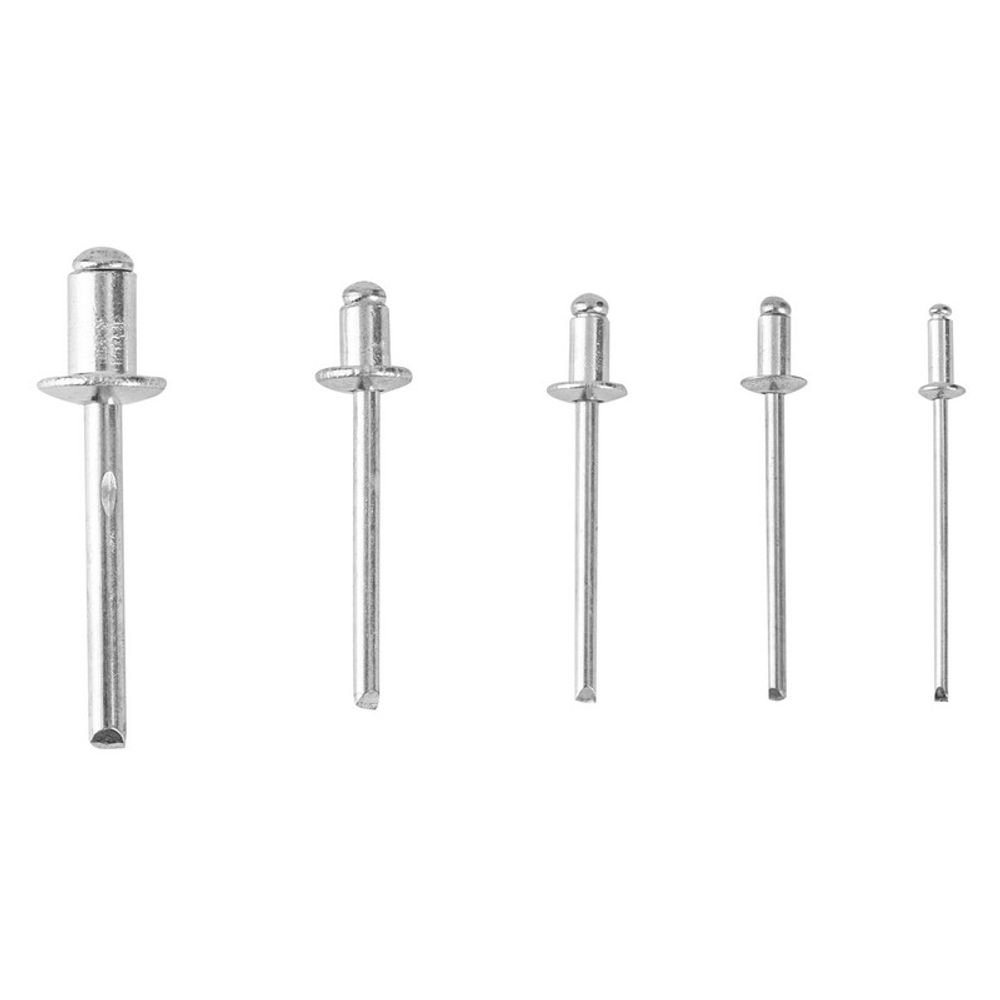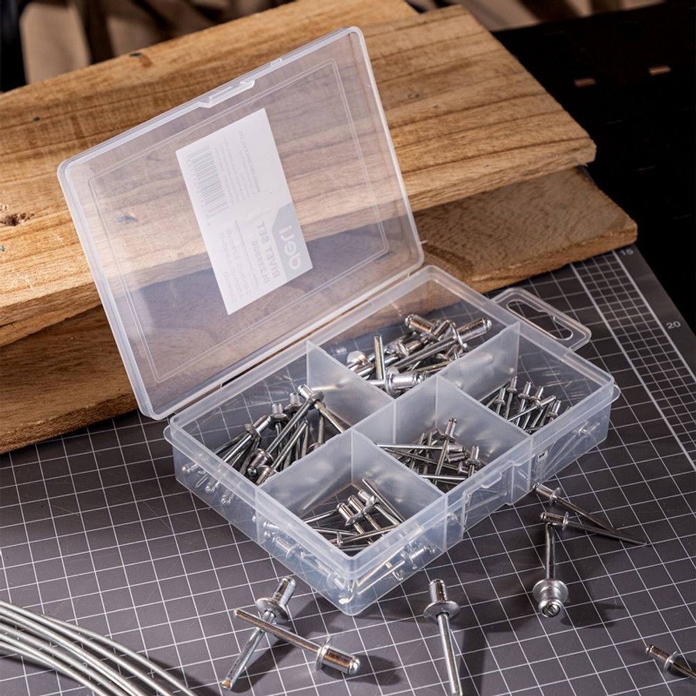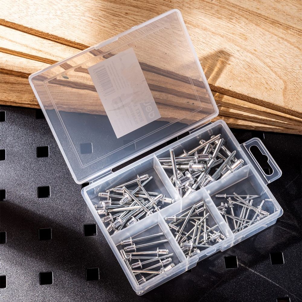 Набор состоит из заклёпок разного диаметра (2,4 / 3,2 / 4,0 / 4,8 / 6,0 мм — по 15 штук каждого размера) и поставляется в пластиковом кейсе. Это удобный способ хранения и транспортировки заклёпок, который обеспечивает порядок и сохранность деталей.