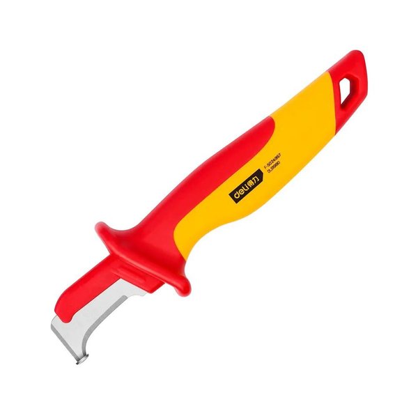 Нож электрика диэлектрический изогнутый с "пяткой" Deli DL515180 180мм, нержавеющая сталь, сертификат VDE для работ под напряжением до 1000 В, чехол для режущей части. Бренд: Deli. Артикул: DL515180. Гарантия: 1 мес.