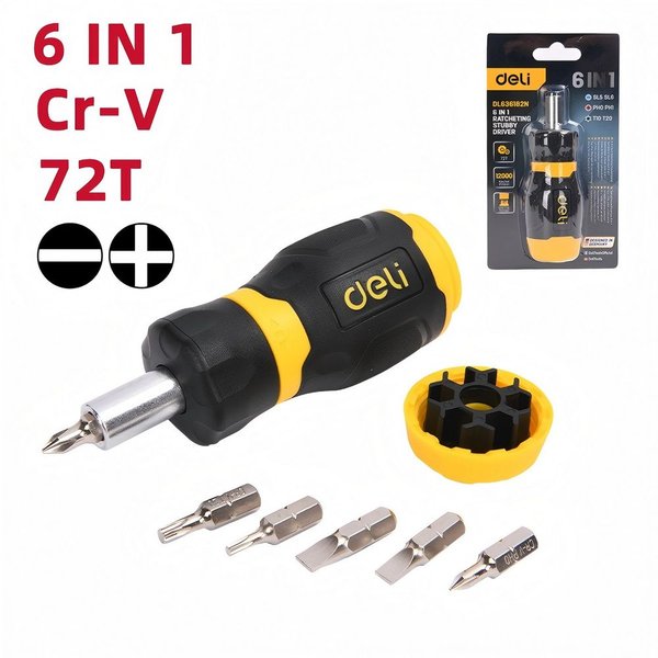 Отвертка с трещоткой с набором бит 6-в-1 Deli DL636182N 6 бит Cr-V (SL5,SL6,PH0,PH1,T10,T20), трещотка 72 зуба. Бренд: Deli. Артикул: DL636182N. Гарантия: 1 мес.